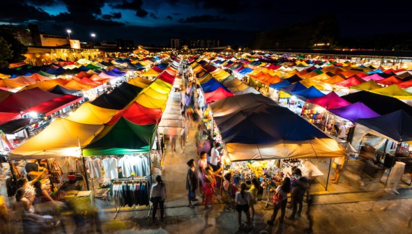 Salah satu daya tarik utama dari wisata malam di Bangkok adalah pasar malamnya yang beragam. Tempat-tempat seperti Asiatique, Rot Fai Market, dan JJ Green Night Market menjadi tujuan favorit bagi mereka yang ingin merasakan kebisingan dan keramaian malam sambil mencari barang-barang unik, cendera mata, atau sekadar menikmati jajanan lokal. Pasar malam ini tidak hanya menjadi surga belanja, tetapi juga merupakan tempat di mana pengunjung dapat bersantai sambil menikmati atmosfir lokal dari kota ini.